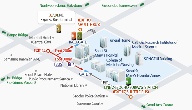 | Gyeongbu Expressway | Banpo IC(towards Express Bus Terminal)-first intersection-200 meters ahead-over underpass (Sapyeong Underpass)-a u-turn and 20 meters ahead - Seoul St. Mary's Hospital |